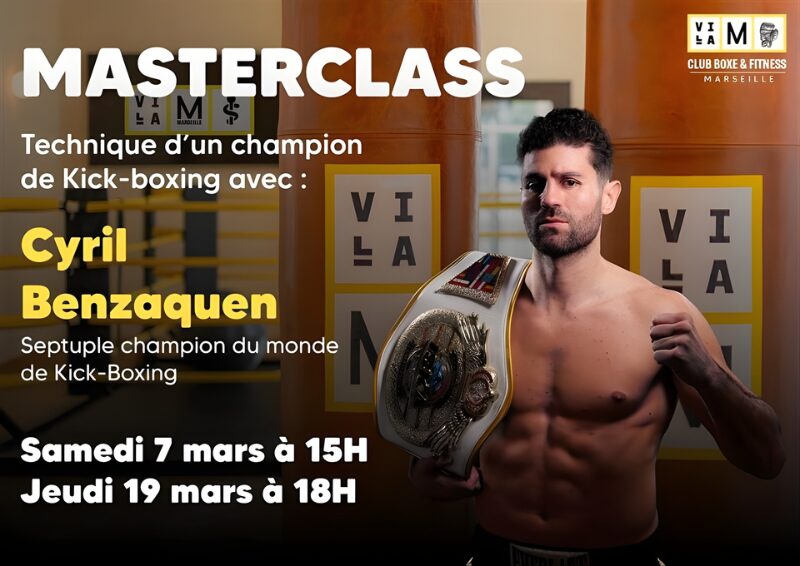 Le Club Boxe & Fitness de Villa M Marseille accueillera, le samedi 7 mars à 15h et le jeudi 19 mars à 18h, des masterclass exclusives animées par Cyril Benzaquen, septuple champion du monde de kick-boxing et figure incontournable du sport de haut niveau.
